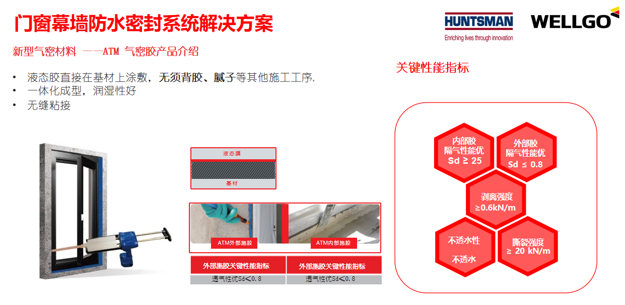 ATM 氣密膠:無(wú)需背膠或膩?zhàn)?,?nèi)外部施膠分別實(shí)現(xiàn)隔汽(Sd≥25)和透汽(Sd≤0.8),避免水汽滯留。